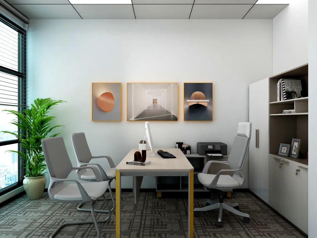2、针对光源比较单一的办公室,要特别注意被光源直射的墙面,不能选择过浅的颜色,而是要选择一些饱和度偏高的吸光色,避免因墙面色反光能力过强而造成员工的视觉疲劳,而办公家具的色系搭配上就要尽量简单并保持统一,反之会显得空间花哨而局促,建议可以选择一些灰色、白色、黑色这样的百搭色,让这块空间氛围沉稳而不失活力。
